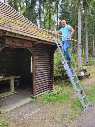 Unser Verein Freie Wähler Bad Elster e.V. hat vor Jahren die Patenschaft für die Römerhütte am Arnsgrüner Kirchsteig übernommen. In Absprache mit unserem Elsteraner Revierförster Christoph Schultis wurde eine Reinigung und Bestandssicherung der Schutzhütte vereinbart. Dazu gab es Arbeitseinsätze an insgesamt vier Samstagen. Sieben freiwillige Helfer trafen sich am 7. Oktober, am 14. Oktober und 21. Oktober 2023 an der Römerhütte. Dabei wurden alle Außenwände gereinigt und fast vollständig mit Holzschutzlasur versehen. Weiterhin wurde das Holzschindeldach auf drei Seiten vom Moos befreit. Zum Abschluss der Arbeiten traf sich der Vorstand unseres Vereins am Samstag, dem 11. Mai 2024. Dabei wurden die vollständige Entfernung des Mooses auf dem Dach und der Oberflächenschutz mit Holzlasur an der Rückseite abgeschlossen.
